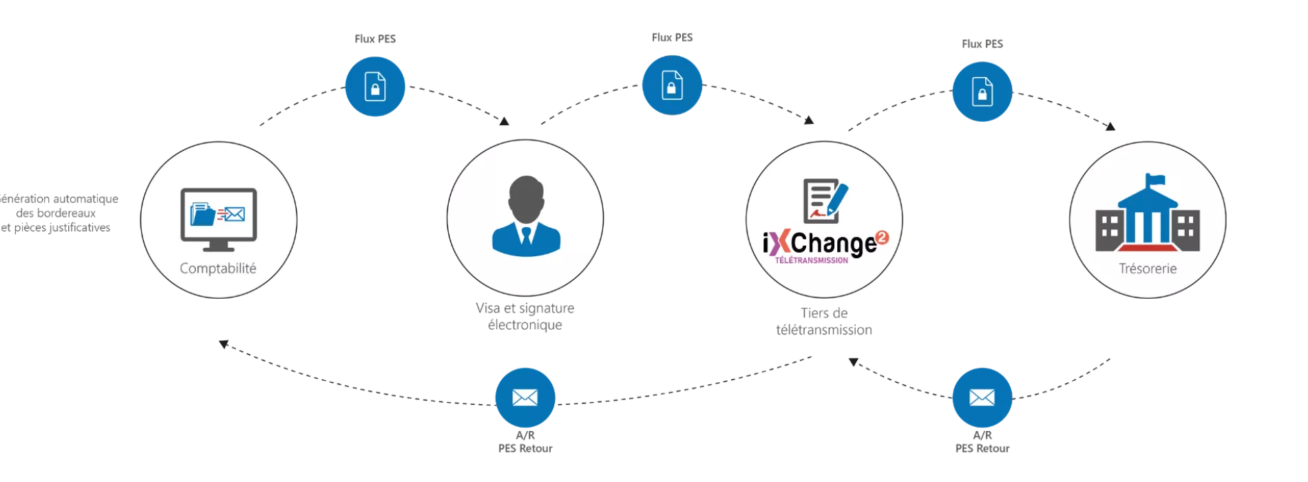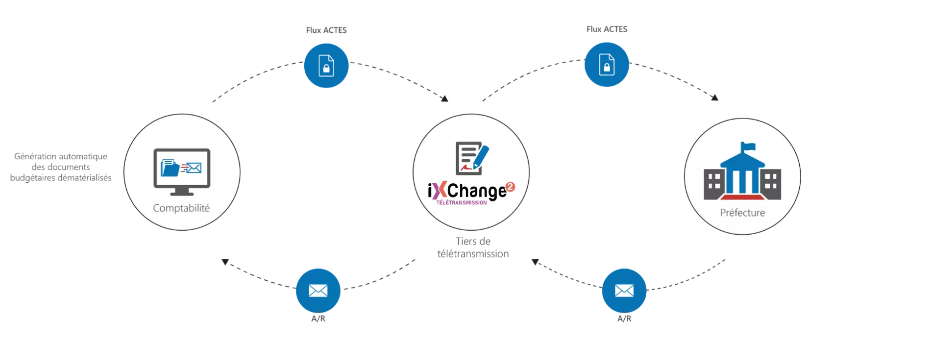 La plateforme iXChange 2 favorise l’échange dématérialisé d’informations entre les collectivités et l’Etat. Elle permet ainsi la transmission des actes aux préfectures via le protocole ACTES, ainsi que l’envoi des flux financiers, pièces comptables et justificatives à la trésorerie.