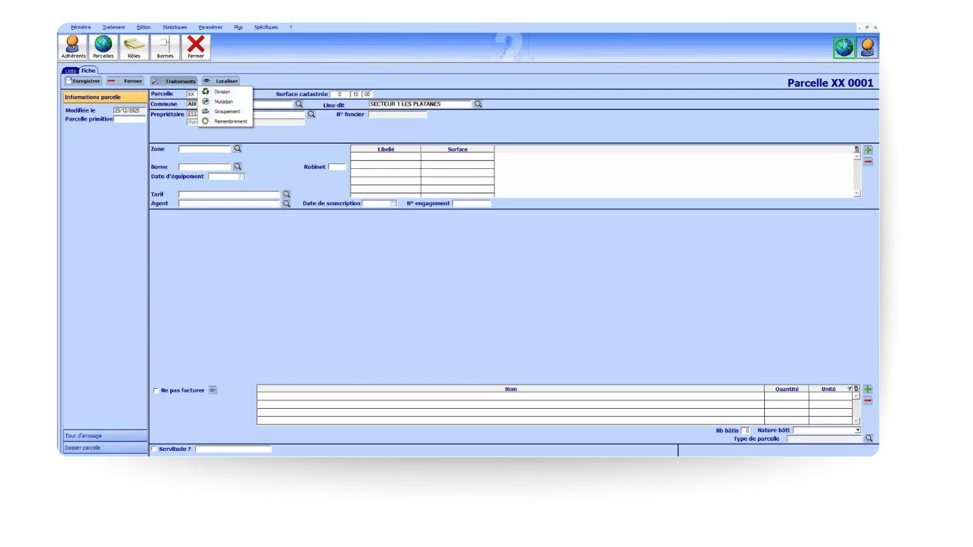 Centralisez adhérents, parcelles et réseau, avec un historique fiable des évolutions.