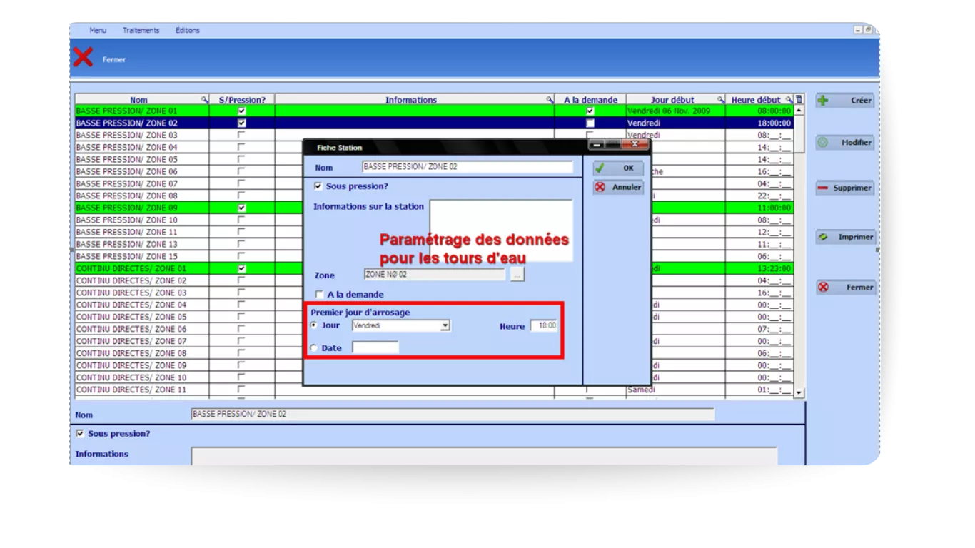 Planifiez et calculez les tours d’eau : stations, campagnes et calendrier d’arrosage.
